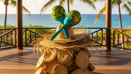 Colorful maracas and woven hats on rustic wooden table. That the image is generated using AI.