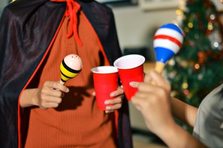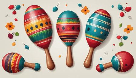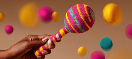 Colorful hand-painted maracas held against a backdrop with vibrant paper confetti AI