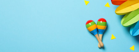 Traditional maracas and sombrero for Cinco de Mayo party celebration on wooden boards, generative ai