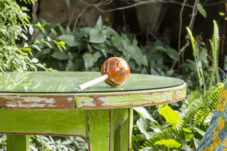 A beautifully crafted maraca features vibrant colors and intricate patterns. It rests on a textured wooden surface, showing its artful detailing and craftsmanship.