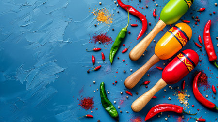 Colorful maracas with chili peppers scattered on vibrant blue background.