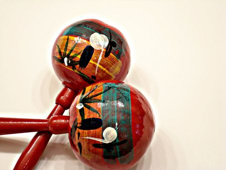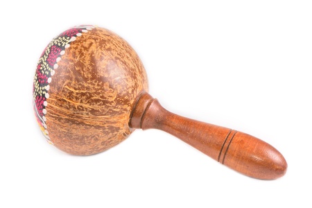A pair of traditional wooden maracas with colorful hand-painted patterns, isolated on a white background