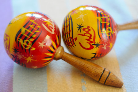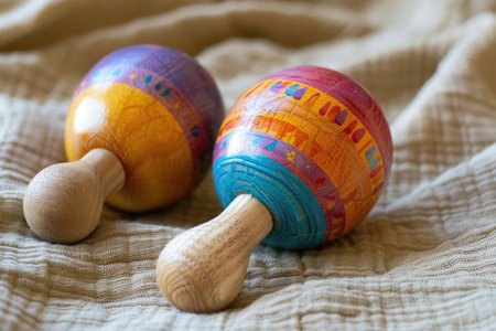 Colorful wooden maracas with vibrant musical motifs on a soft fabric background.