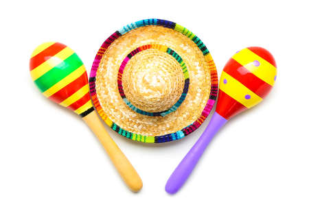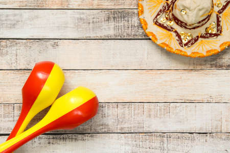 Festive Mexican headdress - sombrero on wooden boards and red and yellow plastic maracas. Symbols of Mexico, background for the holiday Cinco de mayo. Top view. Space for text