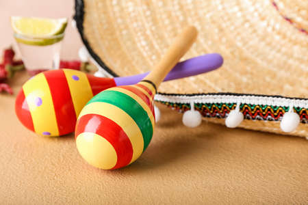 Maracas, toy cactus and sombrero hat on colorful background, flat lay. musical instruments
