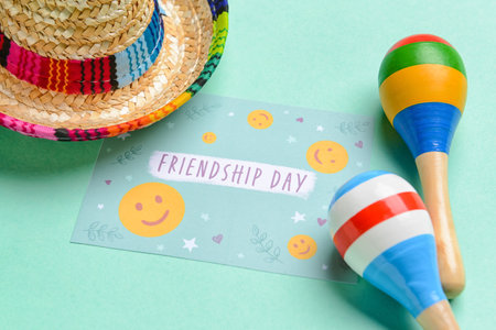 Mexican sombrero with maracas and greeting card for Friendship Day on color background