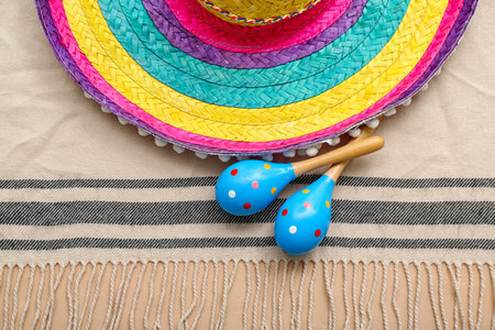 Mexican background serape striped blanket with sombrero maracas . Generative Ai