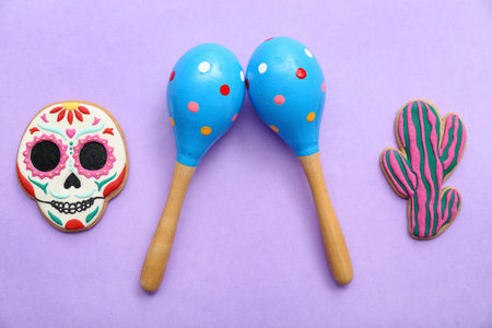 Festive colorful decorations including maracas and a fan on a warm purple backdrop