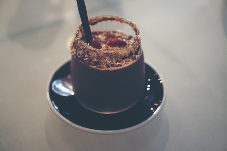 Closeup of creamy sweet exotic party cocktail in restaurant at bar background. Glass on bar table, refreshing drink with straw. Cream soda or other.