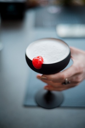 The girl takes a black glass with a cocktail. Spirituous drink with cherry. Hand on the background of a napkin and a table in a restaurant.