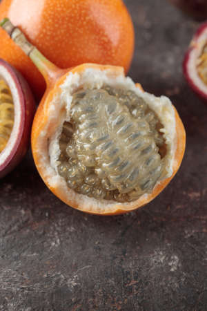 ripe organic passion fruit on a dark background