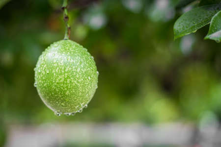 Passion fruit selection hand holding fresh fruit on blurred background with copy space