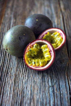 Passion fruits on wooden background