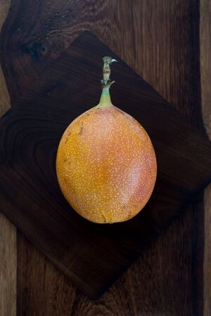 isolated granadilla - exotic tropical fruit on wooden background - studio shot from above