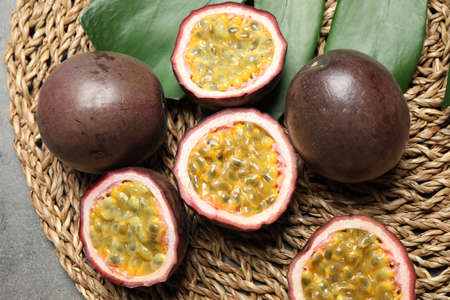 Passion fruits (maracuyas) and green leaf on wicker mat, flat lay