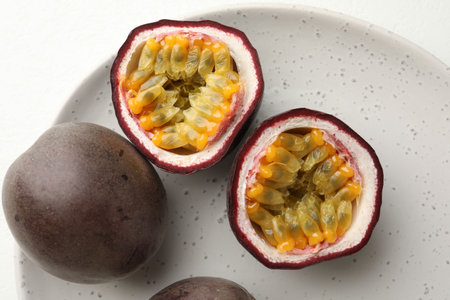 Discover vibrant passion fruit halves beautifully arranged on a white background. This fresh tropical fruit offers a burst of flavor and nutrition ideal for healthy recipes.