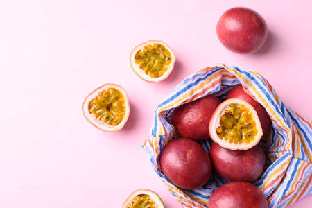 Passion fruit in fabric bag on pink background, Tropical fruit in summer season