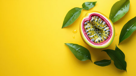 A vibrant image of halved passion fruit surrounded by green leaves on a bright yellow background, showcasing the fruit's unique texture and colors, perfect for healthy food inspiration.