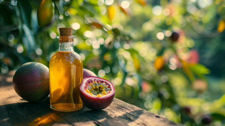 Maracuja oil in a glass bottle, with fresh passion fruits on a rustic wooden table, garden background with copy space. Natural wellness, aromatherapy and organic skin care concept.