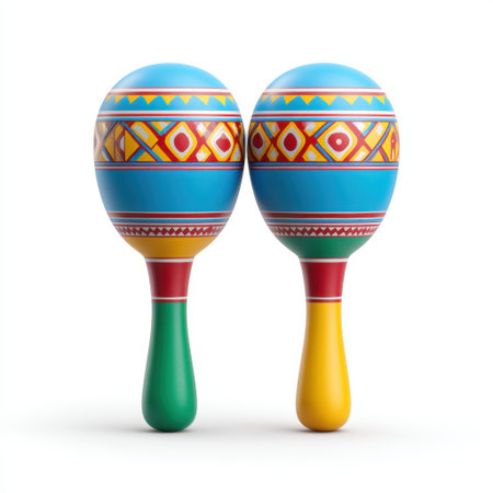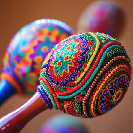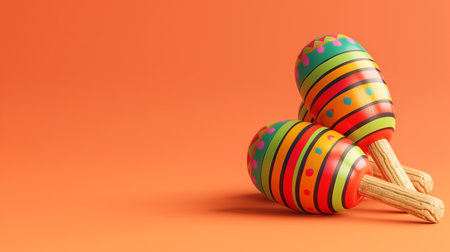 Vibrantly patterned maracas set against a vivid orange background, embodying the rhythm and spirit of festive music