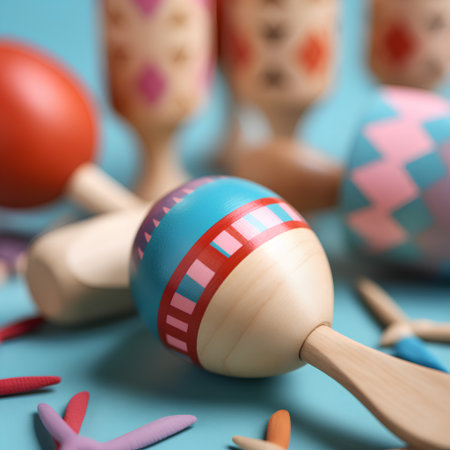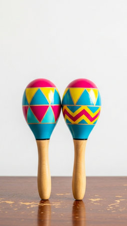Vibrant wooden maracas displayed on a rustic wooden surface, featuring intricate patterns and colors, highlighting cultural significance and craftsmanship in musical instruments, AI generated
