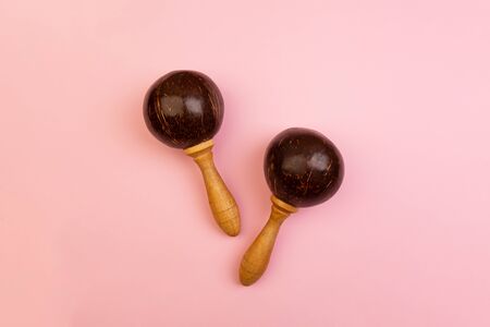 Two mexican maracas isolated on pink background. Traditional folk musical instruments. Elements of national culture. Flat lay. Latin music.