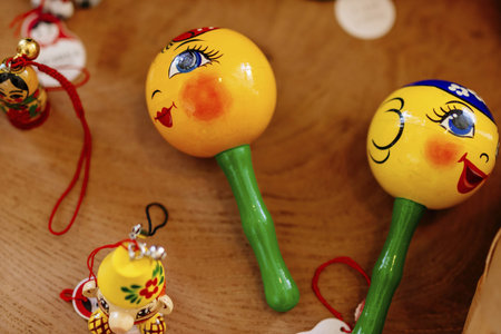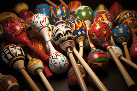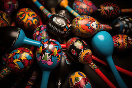 Multicolored wooden maracas with ornaments. Spanish musical instrument. Cinco de Mayo.