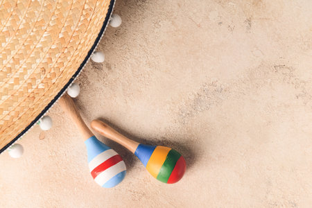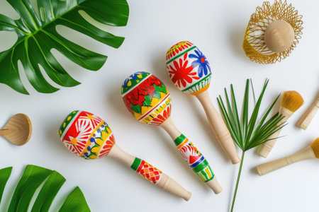 Colorful maracas and woven hats on rustic wooden table. That the image is generated using AI.