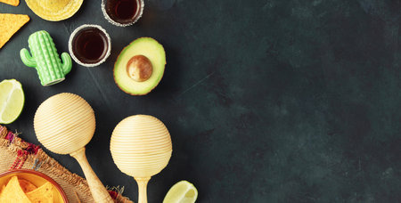 Cinco de Mayo-inspired flat lay featuring maracas, tequila shots, lime, nacho chips, avocado on a dark vintage background