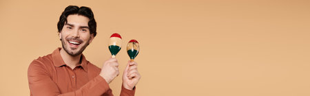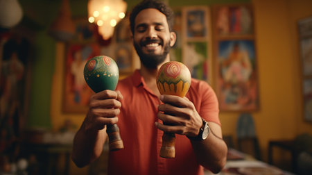A young man joyfully plays maracas, radiating energy in a colorful space.