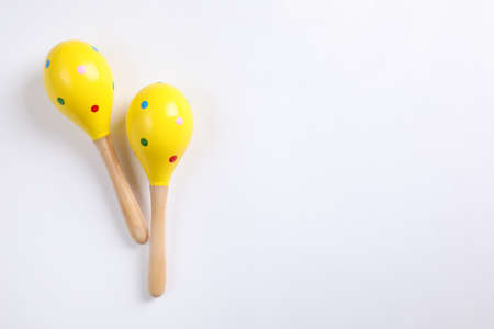 Bright wooden maracas on white background, top view. Montessori musical toy