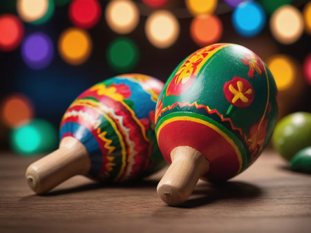 Mexican maracas on wooden table with colorful bokeh background