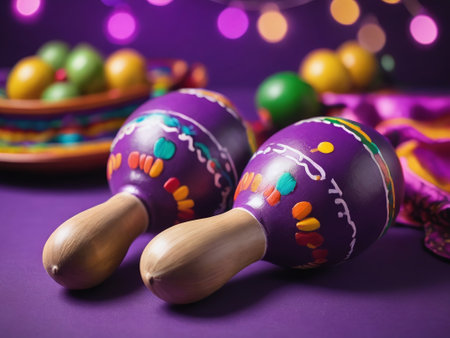 Maracas and colorful beads on purple background with bokeh.
