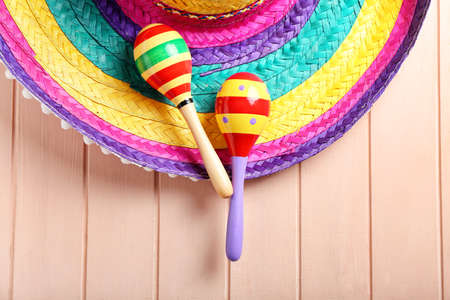 Mexican maracas and sombrero on color wooden background