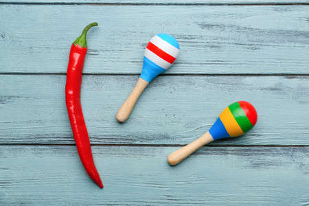 Hot chili pepper and Mexican maracas on blue wooden background