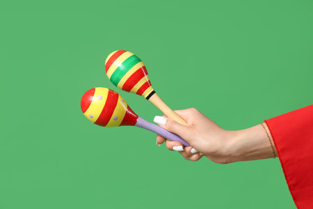 Woman with maracas on green background. Cinco de Mayo celebration