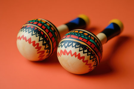 Two wooden maracas with colorful tribal patterns lie on an orange background, ready to create rhythmic music