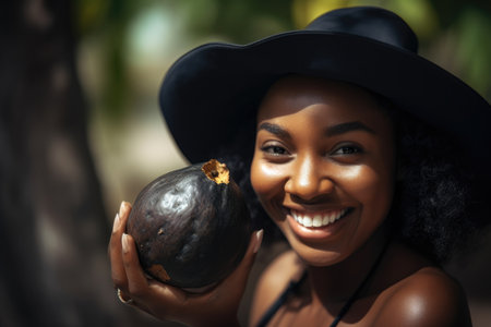 Radiant Woman Holding a Black Sapote Fruit, Embracing Health and Wellness