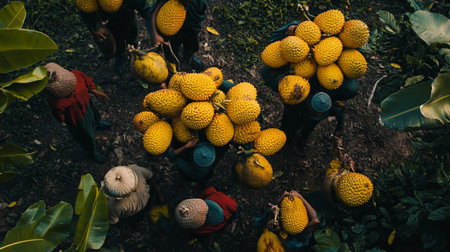 Aerial view of man and woman picking ripe longan fruit from the tree in the garden