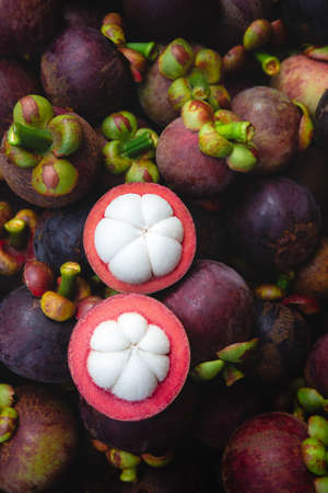 Fresh ripe mangosteen fruits and cross section showing the thick purple skin and white flesh.
