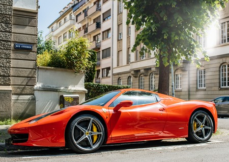 STRASBOURG, FRANCE - MAY 28, 2018: Side view of expensive luxury car of red color parked on street in sunlight Red Ferrari in French city