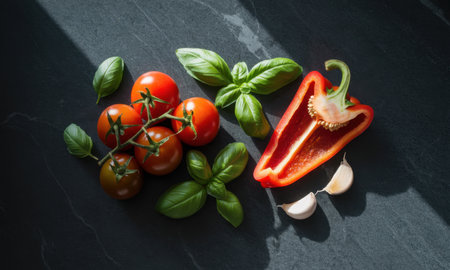 Fresh cherry tomatoes on vine, basil leaves, sliced red bell pepper, and garlic cloves arranged on a dark stone surface, ready for cooking.