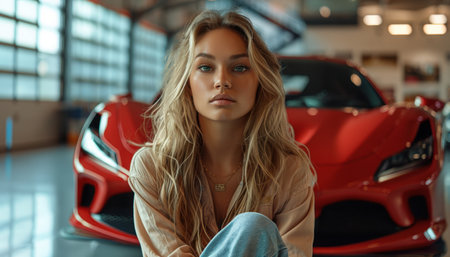 Beautiful young woman sitting on the floor in the car showroom