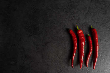 Four red fresh chili pepper on black background, copy space