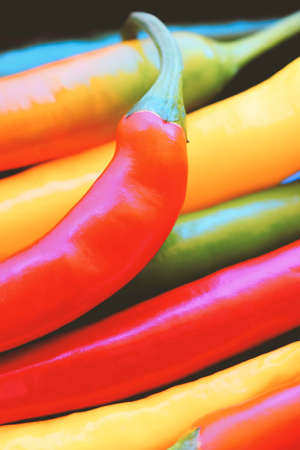 Chilli peppers of different colors: red, green, orange and yellow.