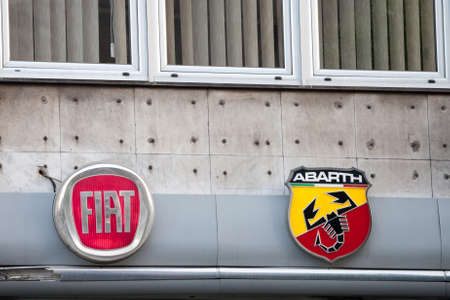BELGRADE, SERBIA - MAY 8, 2020: Fiat and Abarth logos in front of their car dealership for Belgrade.