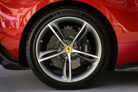 Maranello, Italy - April 24, 2016: Ferrari Progetta F142 wheel and rim. Sports wheel with brand logo in the center, bolts, yellow brake caliper and ventilated brake disc.