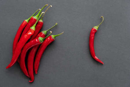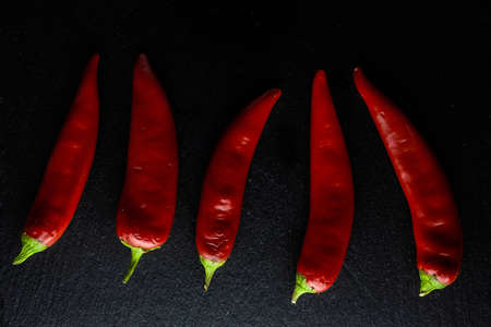 Row of red hot chili peppers on black background. Pods of chili peppers. Hot healthy seasoning.