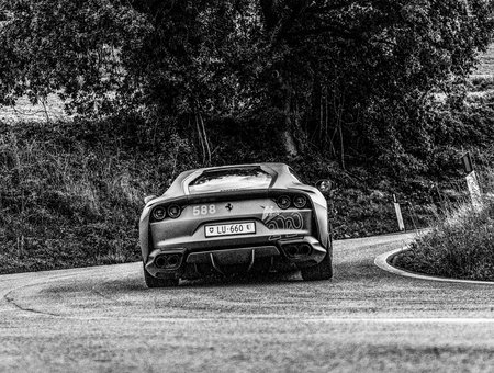 ITALY - OCT 24 - 2020: FERRARI 812 SUPERFAST on an old racing car in rally Mille Miglia 2020 the famous italian historical race (1927-1957)
