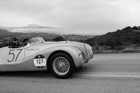 CAGLI, ITALY - OCT 24 - 2020: ALFA ROMEO 6C 2500 SUPER SPORT COMPETIZIONE 1947 on an old racing car in rally Mille Miglia 2020 the famous italian historical race (1927-1957